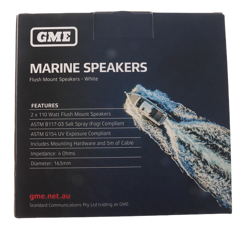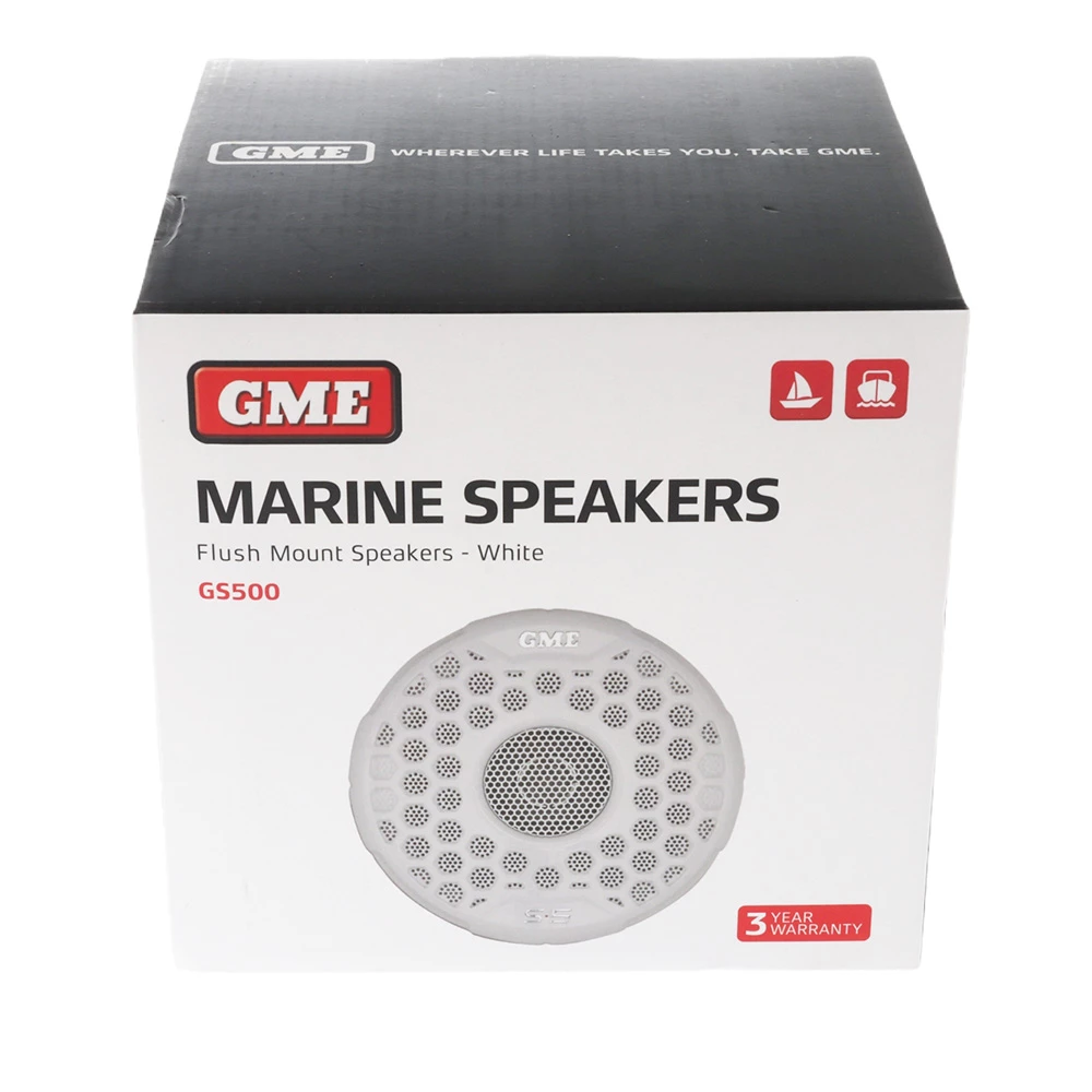 The GME GS500 S5 Flush Mount 2-Way Marine Speakers come as a pair of S5 Flush Mount 110w coaxial marine speakers to use with your radio system or stereo system. This speaker kit includes all necessary mounting hardware, a mounting template, instruction manual and two 5m lengths of cable. This product comes with a three-year warranty.
