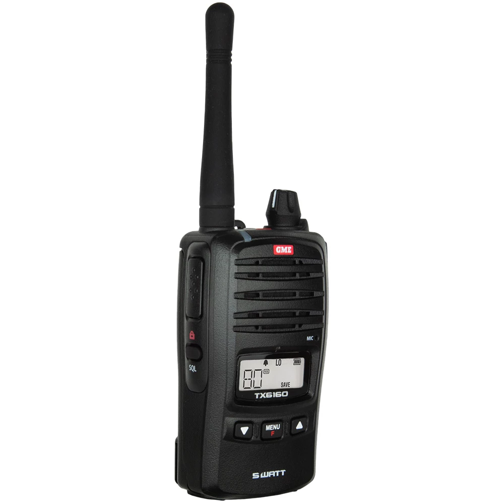 The GME TX6160X IP67 Handheld UHF CB Radio features class-leading 5 watt transmission power, an IP67 ingress-protection rating for outstanding performance and years of reliable use in the harshest environments, up to 30 hours battery life, VOX Hands-free mode, and a built-in LED torch. This compact and powerful radio comes with a built-in LED torch and a rugged mechanical design, ensuring no matter how far off the beaten track your adventure takes you, you can stay connected.